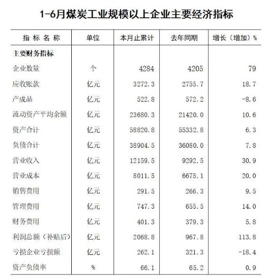 日前,2021年上半年全國規模以上煤炭企業主要經濟指標公布。 上半年,煤炭行業經濟形勢總體穩中向好,行業營收及利潤均實現較高增長,虧損企業虧損額下降;行業營收增幅首次超過全國工業行業平均水平,企業資產負債率略有提高,應收賬款增加。 指標顯示,上半年4284家規模以上煤炭企業營業收入12159.5億元,同比增長30.9%,增幅比規模以上工業行業平均高3個百分點;營業成本8011.5億元,同比增長20.0%;應收賬款3272.3億元,同比增長18.7%;利潤總額(補貼後)2068.8億元,同比增長113.8%。 上半年,規模以上煤炭企業資產合計58820.8億元,同比增長6.3%;負債合計38904.5億元,同比增長7.8%;資產負債率66.1%,比去年同期增加0.9個百分點。 指標顯示,上半年,規模以上煤炭企業流動資產平均餘額23680.3億元,同比增長10.6%;企業銷售費用、管理費用和財務費用,分別較上年增長9.5%、14.0%和5.8%。(數據來源國家統計局)