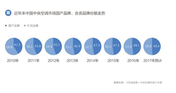 8月yue下xia旬xun,國guo內nei家jia電dian企qi業ye上shang市shi公gong司si中zhong期qi報bao告gao集ji中zhong發fa布bu,幾ji大da巨ju頭tou業ye績ji看kan點dian頗po多duo。國guo產chan幾ji大da家jia電dian企qi業ye無wu論lun是shi營ying業ye收shou入ru還hai是shi淨jing利li潤run都dou呈cheng現xian大da幅fu增zeng長chang態tai勢shi。 緊跟其後“中國企業500強”榜單發布再次聚焦市場眼球。以海爾、美的、格力領銜的八家家電企業營收總規模突破8700億元。海爾以2016.08億元領跑,美的以1598.41億元排名101位緊隨其後。 幾(ji)大(da)家(jia)電(dian)巨(ju)頭(tou)靚(liang)麗(li)成(cheng)績(ji)單(dan)的(de)背(bei)後(hou),空(kong)調(tiao)產(chan)品(pin)扮(ban)演(yan)著(zhe)極(ji)為(wei)重(zhong)要(yao)的(de)角(jiao)色(se),特(te)別(bie)是(shi)過(guo)去(qu)的(de)一(yi)年(nian),空(kong)調(tiao)產(chan)業(ye)整(zheng)體(ti)上(shang)升(sheng)趨(qu)勢(shi)明(ming)顯(xian),而(er)其(qi)中(zhong)中(zhong)央(yang)空(kong)調(tiao)作(zuo)為(wei)近(jin)年(nian)來(lai)備(bei)受(shou)矚(zhu)目(mu)的(de)細(xi)分(fen)單(dan)元(yuan),盈(ying)利(li)能(neng)力(li)和(he)市(shi)場(chang)增(zeng)長(chang)速(su)度(du)都(dou)有(you)大(da)幅(fu)提(ti)升(sheng)。 國內幾大行業媒體發布的2017年上半年中央空調市場報告顯示,2017年上半年中國中央空調市場整體增幅超過25%,半年容量首次突破400億元關口,市場信心空前高漲。 其中值得關注的是,以格力、海爾、美的為代表的國產品牌占比份額再次提升。公開的數據顯示,2010年國產品牌中央空調占比41.2%,而到2016年年底,這個數字變成了48.1%,進展勢頭不似家用空調當年開疆拓土時摧枯拉朽,但筆者認為改變的力量已經形成並積聚。隨著 “國進外退”的(de)整(zheng)體(ti)趨(qu)勢(shi)推(tui)導(dao),國(guo)家(jia)對(dui)綠(lv)色(se)節(jie)能(neng)技(ji)術(shu)扶(fu)持(chi)力(li)度(du)持(chi)續(xu)加(jia)大(da),國(guo)產(chan)品(pin)牌(pai)超(chao)越(yue)外(wai)資(zi)成(cheng)為(wei)市(shi)場(chang)主(zhu)角(jiao)的(de)趨(qu)勢(shi)已(yi)然(ran)客(ke)觀(guan)存(cun)在(zai)。國(guo)內(nei)幾(ji)大(da)中(zhong)央(yang)空(kong)調(tiao)市(shi)場(chang)研(yan)究(jiu)機(ji)構(gou)一(yi)致(zhi)預(yu)測(ce),國(guo)產(chan)品(pin)牌(pai)市(shi)場(chang)占(zhan)比(bi)將(jiang)會(hui)在(zai)2018年全麵超越外資品牌。