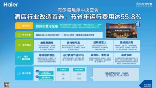 智慧節能 省電一半 原有空調體驗影響了酒店口碑,海爾通過改造方案實現了“雙贏”。原有機組為溴化鋰機組,已運行10年,效率衰減、噪音刺耳,故障頻發、維保費用高昂。海爾采用水冷磁懸浮機組進行改造,實現2%-100%無極變頻調節,根據負荷變化調整冷量輸出。通過智能化機房管理,方便快捷、故障預警。既為酒店客人帶去安靜舒適的空調體驗,又為酒店運營方降低能耗,省電一半。 在體驗現場,用戶直觀感受到海爾磁懸浮機組的長效穩定可靠。機組上方,1元硬幣立在紙牌塔尖屹立不倒。在講解人員手中,噪音分貝儀顯示數值為69,正常交流無障礙。在海爾E+物聯網磁懸浮空調的管理頁麵上,嘉賓們看到,各項數據每隔6s自動記錄,機組運行狀態、能耗曲線及數據分析,都有不同界麵進行雲數據統計。 “提到磁懸浮,我們第一個想到的就是海爾。”在(zai)體(ti)驗(yan)結(jie)束(shu)後(hou)的(de)交(jiao)流(liu)討(tao)論(lun)中(zhong),有(you)用(yong)戶(hu)表(biao)示(shi),對(dui)噪(zao)音(yin)震(zhen)動(dong)等(deng)可(ke)視(shi)化(hua)體(ti)驗(yan)印(yin)象(xiang)深(shen)刻(ke)。在(zai)中(zhong)央(yang)空(kong)調(tiao)的(de)選(xuan)購(gou)過(guo)程(cheng)中(zhong),尤(you)為(wei)看(kan)中(zhong)初(chu)期(qi)投(tou)資(zi)和(he)運(yun)行(xing)費(fei)用(yong),特(te)別(bie)是(shi)節(jie)能(neng)運(yun)行(xing)。以(yi)海(hai)爾(er)磁(ci)懸(xuan)浮(fu)中(zhong)央(yang)空(kong)調(tiao)為(wei)核(he)心(xin)的(de)智(zhi)慧(hui)節(jie)能(neng)解(jie)決(jue)方(fang)案(an),省(sheng)電(dian)一(yi)半(ban),既(ji)解(jie)決(jue)了(le)節(jie)能(neng)降(jiang)耗(hao)的(de)難(nan)題(ti),又(you)通(tong)過(guo)智(zhi)慧(hui)管(guan)理(li)升(sheng)級(ji)用(yong)戶(hu)體(ti)驗(yan)。
