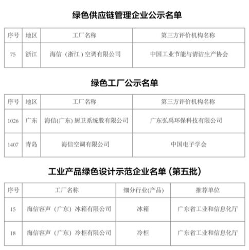 近日,工業和信息化部公示了2023年度綠色製造名單,海信空調有限公司、海信(廣東)廚衛係統股份有限公司入選國家綠色工廠;海信(浙江)空調有限公司入選國家綠色供應鏈管理企業。在工信部第五批工業產品綠色設計示範企業名單中,海信容聲(廣東)冰箱有限公司、海信容聲(廣東)冷櫃有限公司同樣榜上有名。至此,海信家電累計已有國家級綠色工廠7個、國家綠色供應鏈2個、國家級工業產品綠色設計示範企業5個、省級綠色工廠4個,數量及覆蓋率處於行業領先地位。