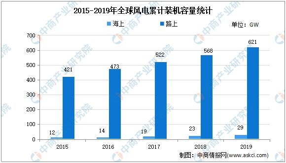 近年來,在陸上風電發展趨於穩定的同時,海上風電呈現了高速發展的趨勢。截至2019年,全球風電累計裝機容量為650吉瓦。其中,陸上風電累計裝機容量為621吉瓦,海上風電累計裝機容量為29吉瓦;與2008年相比,陸上風電累計裝機容量年均複合增長率為16.21%、海上風電累計裝機容量年均複合增長率為35.81%。