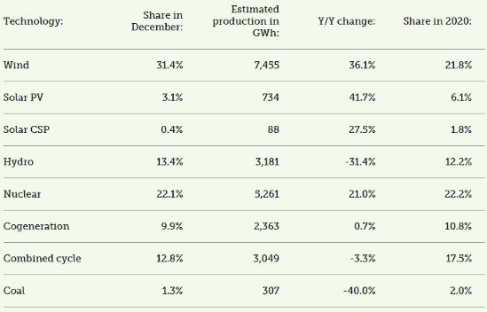 根據西班牙電網運營商西班牙Red Electrica de Espana(REE)發布的最新估計,西班牙12月的50.4%的電力來自可再生能源。 新的數字是從11月份增加的,當時估計可再生能源占該國總發電量的40.6%。 12月28日,西班牙的風電場創造了創紀錄的日發電量403.8 GWh,REE說這是自2007年以來國內風電生產的最高日水平。 風電場在12月份占總發電量的31.4%,取代了核能,成為本月最大的電力生產商。 在2020年的12個月中,可再生能源發電量為110,577 GWh,占西班牙總發電量的44%。 REE估算如下表所示:
