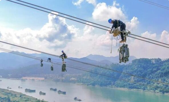 廣東電網能源發展有限公司的高空作業人員進行跨越西江段的間隔棒安裝