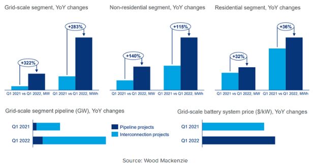 Wood Mackenzie在其最新的“美國儲能監測”報告中表示,就兆瓦時電網規模的儲能而言,該領域剛剛迎來了有記錄以來最強勁的第一季度:2022 年第一季度部署了 2339MWh。