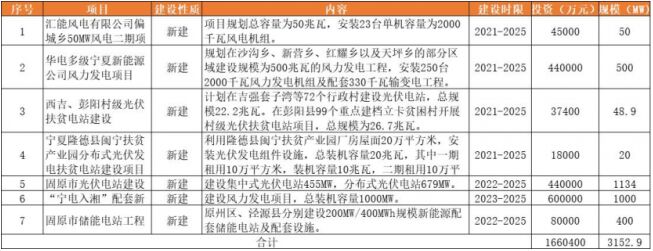 近期,固原市人民政府辦公室印發固原市自然資源保護和利用“十四五”規劃的通知。根據光伏們查詢,在固原市自然資源保護和利用“十四五”規劃建設項目庫中,有關清潔能源產業的項目共10個。其中包括光伏、風電、儲能的項目共7個,合計新能源新建規模3152.9MW,總投資金額166億元。具體項目名單如下:
