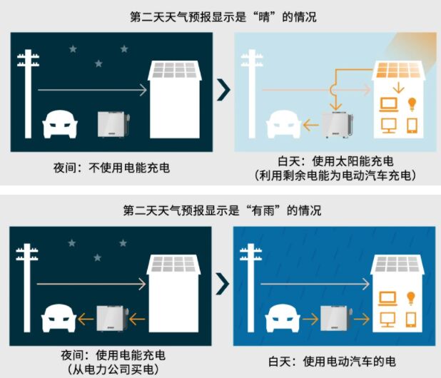 V2H-充放電器作為能源管理可單獨使用,但通過與HEMS結jie合he,便bian可ke以yi使shi用yong更geng多duo功gong能neng,比bi如ru天tian氣qi預yu報bao功gong能neng,晴qing天tian時shi,光guang伏fu發fa電dian既ji能neng滿man足zu家jia庭ting內nei部bu的de電dian力li,同tong時shi給gei電dian動dong汽qi車che充chong電dian。如ru果guo是shi陰yin雨yu天tian,則ze可ke在zai電dian價jia低di的de夜ye間jian進jin行xing充chong電dian以yi應ying對dui白bai天tian的de用yong電dian需xu求qiu。