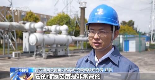 南方電網雲南電力科學研究院高級研究員鄭欣:能夠儲存200立方米的氫氣,它的儲氫密度是非常高的,如果換成普通的常用的三個兆帕的儲氫罐,體積要增加20倍,可能這樣儲存的氫氣就要占滿這樣大半個場地的儲罐。