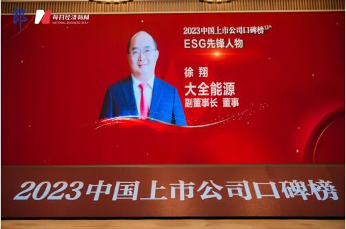 11月17日,由每日經濟新聞發起的“中國上市公司口碑榜”評選獲獎名單於第十二屆中國上市公司高峰論壇上正式揭曉。大全能源副董事長徐翔憑借其帶領企業ESG治理實踐,持續深化企業可持續發展的卓越表現,榮獲2023年度“ESG先鋒人物獎”。此次ESG先鋒人物獎的評選,評價體係立足於自身海量結構化數據、AI機器學習技術等,綜合上市公司各類公告、媒體輿情、政府機構及第三方等數據來源,形成指標數據庫;同時運用多種算法實現指標數據的提取、計算和評級結果輸出,加工成評價結果數據庫,最終實現上市企業的ESG績效的有效量化,獎項的科學性和含金量廣受各界認可。作為今年新設重磅獎項之一,“ESG先鋒人物獎”的關注度與份量不言而喻。此次徐翔獲此殊榮,一方麵,源於徐翔以先進的ESG理念引領大全能源發展的出色實踐;另一方麵,也正是業界對於大全能源積極踐行ESG可持續發展、推動綠色轉型先鋒地位的高度認可。