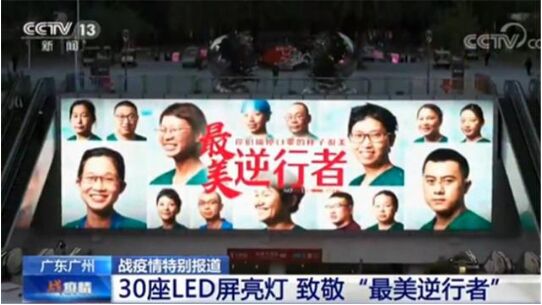從2月17日開始,廣東廣州中心城區的30座LED大屏投影出了多幅“最美逆行者”的照片,為奮戰在湖北疫情一線的醫務人員送上鼓勵和祝福。