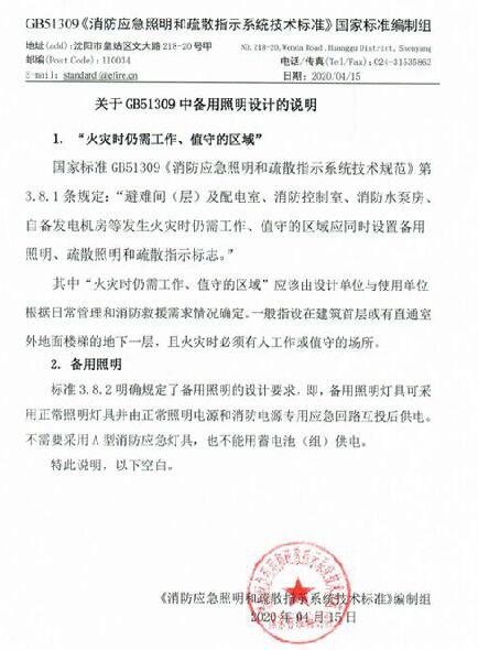 4月15日,國家標準編製組發布公告,關於GB51309中備用照明設計的說明。 此說明包括兩點:“火災時仍需工作、值守的區域”以及備用照明。