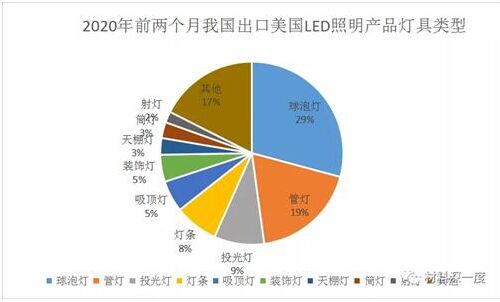二、LED照明產品品類出口(美國)分布情況 從出口品類結構來看,2020年前兩月球泡燈(未列名燈具除外)依然占據出口的LED照明產品最大比重,占整體出口額的29%,其次是管燈、透光燈、燈條等,占整體出口額分列19%、9%、8%,相較於19年,產品品類的占比出現重大變化變化,球泡燈出口占比上漲了12個百分點,管燈出口占比超過了投光燈,同比上漲了6個百分點,投光燈同比下滑了4個百分點。