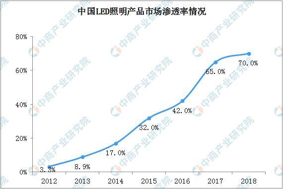 從滲透率來看,中國是LED照明產品最大的生產製造國,根據國家半導體照明工程研發及產業聯盟(CSA)的統計,中國LED照明產品國內市場滲透率(LED照明產品國內銷售數量/照明產品國內總銷售數量)由2012年的3.3%快速提升至2018年的70%,遠超全球平均水平。