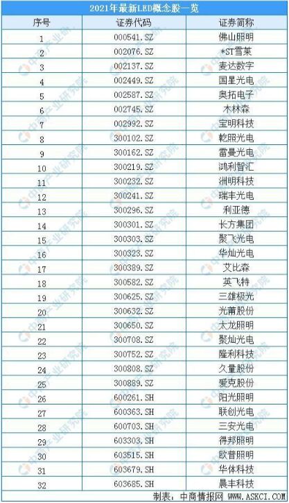 從相關概念企業來看,截至2021年1月13日,LED概念企業主要有以下32家: