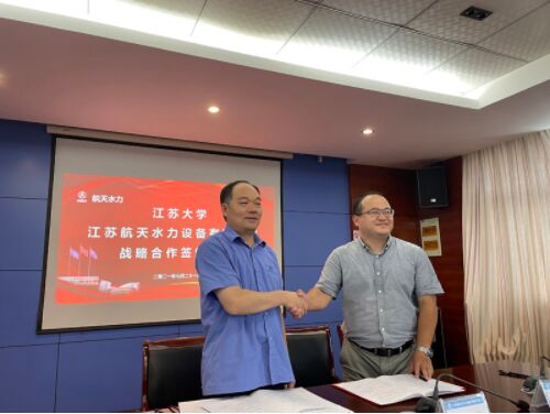 2021年7月21日,江蘇航天水力設備有限公司與江蘇大學簽署校企戰略合作協議,雙方將在校企合作、人才培養等方麵繼續深入合作,共同推動“產學研用”高質量發展。江蘇大學黨委書記袁壽其、江蘇大學能動學院黨委書記康燦、江蘇大學流體中心黨委書記張德勝等院校領導出席儀式。