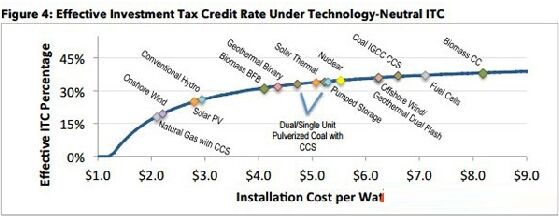 近日,美國一份最新出台的與光熱發電行業發展密切相關的投資稅收抵免政策(ITC)提案建議:從2016年底要再次提高光熱發電項目的投資稅收抵免政策的補貼額度。 而根據此前奧巴馬政府的2015財政預算,ITC政策在2016年到期後將被廢除,以生產稅收抵免(PTC)政策予以代替,屆時光熱發電項目獲得總投資補貼的額度將從30%降至10%。 上述新的ITC提案是由AmitRonen提出的,曾作為參議員MariaCantwell副辦公室主任的他於2008年製定了為期8年的ITC政策。目前,任職華盛頓大學太陽能研究所主任的AmitRonen正在建議國會重新考慮可再生能源政策,但是他擔憂太陽能行業所追求的ITC政策的短期延期不太可能獲得立法許可。 Ronen和JamesMueller共同編撰的《太陽能軟著陸:做出正確選擇以避免ITC政策懸崖》一文提議,國會不應該再像此前那樣製定一刀切的ITC政策,而是要站在技術路線中立的角度來製定ITC政策,該政策應基於技術規模化和成熟化之後項目初始安裝成本下降的幅度和趨勢來製定,因此不同的技術路線將會享受不同的ITC補貼額度。按照該提案建議的思路,光熱發電項目的ITC補貼額度應高於光伏項目,因為目前隻有很少一部分光熱發電項目獲得了開發,還根本沒有實現規劃化效益。 如下圖所示,在當前的成本條件下,光熱發電技術的ITC補貼額度應超過30%,而光伏發電技術則應低於30%。