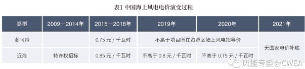 2015年以前,我國海上風電電價政策基本上以特許權招標為主。隨著2015年12月22日,國家發展改革委印發《關於完善陸上風電光伏發電上網標杆電價政策的通知》(下稱《通知》),我國開啟了海上風電固定電價周期。《通知》首次明確了海上風電潮間帶與近海項目的上網電價,分別為0.75元/千瓦時、0.85元/千瓦時。