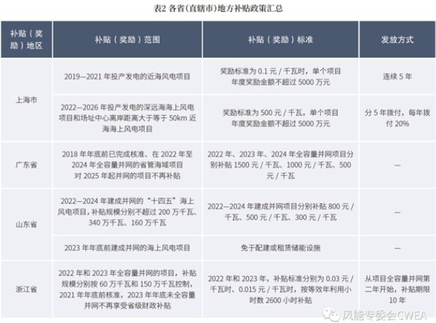 2020年1月20日,財政部、國家發展改革委、國家能源局印發《關於促進非水可再生能源發電健康發展的若幹意見》進一步明確,新增海上風電和光熱項目不再納入中央財政補貼範圍,按規定完成核準(備案)並於2021年12月31日前全部機組完成並網的存量海上風力發電和太陽能光熱發電項目,按相應價格政策納入中央財政補貼範圍。這意味著,自2022年起,我國海上風電項目不再納入中央財政補貼範疇,海上風電開發進入地方補貼接力時期。