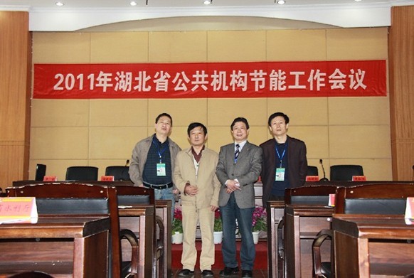 會議期間大明燈業營銷總監文純陽(右二)與湖北省節能協會會長王治明(左二)、湖北省節能公司總經理李堂(右一)、副總經理朱福祥(左一)在一起合影