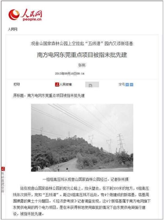 追溯起來,可以說早在2002年,廣東電網公司東莞市供電局就在未經公園同意,也未向公園方提供國家林業、國土資源等部門關於同意在公園內架設高壓線塔的批複文件夾,就擅自違法將多組高壓線塔強行架設在觀音山國家級森林公園內。
