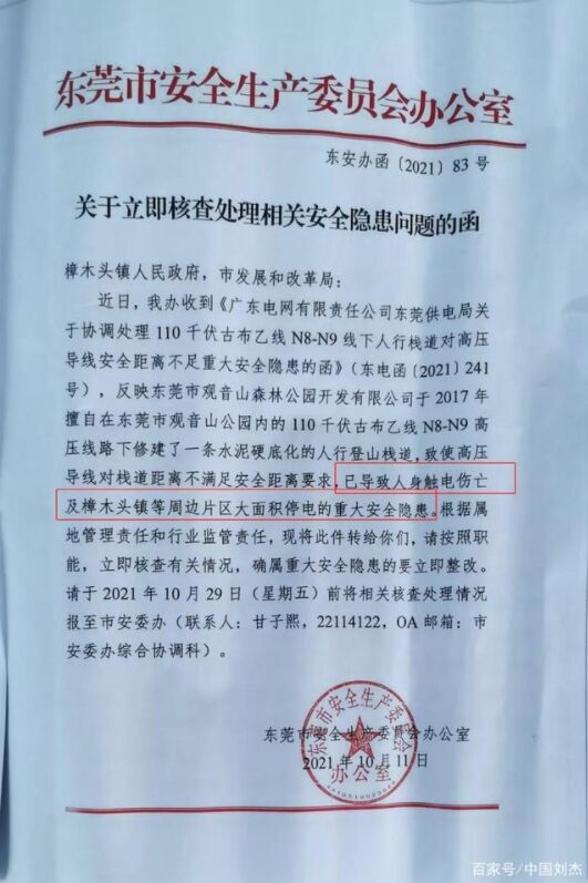 benyingshiyiqijiandandeduishantitafangxingchengdeqingxiediantadetajijinxingweihujiagudegongshi,yinggaishigongdianbumendegongzuoyiwu。jieguo,gongdianbumenbujinzhijiejushouguanyinshanfangdexinhan,faneryu10月11日向樟木頭人民政府發函稱:觀音山公園不自行維護,在我局主動要求維護的情況下,還阻擾我局對影響杆塔安全的邊坡進行維修。並稱“觀(guan)音(yin)山(shan)森(sen)林(lin)公(gong)園(yuan)在(zai)線(xian)行(xing)保(bao)護(hu)區(qu)內(nei)擅(shan)自(zi)堆(dui)填(tian)建(jian)設(she)人(ren)行(xing)棧(zhan)道(dao),並(bing)將(jiang)其(qi)開(kai)放(fang)供(gong)人(ren)員(yuan)活(huo)動(dong)的(de)行(xing)為(wei),已(yi)導(dao)致(zhi)人(ren)身(shen)觸(chu)電(dian)傷(shang)亡(wang)及(ji)樟(zhang)木(mu)頭(tou)鎮(zhen)等(deng)周(zhou)邊(bian)片(pian)區(qu)大(da)麵(mian)積(ji)停(ting)電(dian)的(de)重(zhong)大(da)安(an)全(quan)隱(yin)患(huan)。”