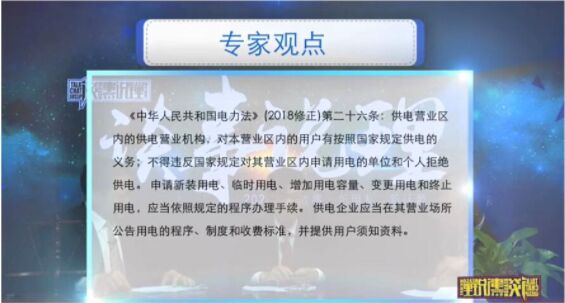 在專題節目中,北京林業大學教授楊朝霞發表觀點:我們說二十幾年來,他80%的電是他自己發電的,就是東莞市供電公司不給。這個來說是違法的。因為我們的《電力法》是明確規定的,就是電力公司、電力的供電機構是有給用戶供電的強製的義務的。你不能拒絕供電,如果是拒絕供電,那麽就是違法,正常供電就是你的強製義務。