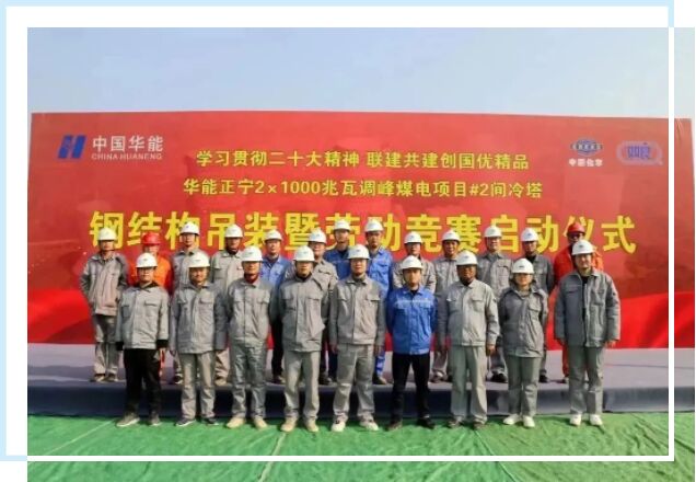 華能正寧2×1000兆瓦調峰煤電間冷塔項目,集主機間冷塔、輔機冷卻塔、脫硫吸收塔、CCUS係統原煙道、煙囪於一體,是世界首例“五塔合一”百萬機組蒙皮內置鋼結構間冷塔,具有節約建設用地、安全風險低、施工周期短、材料可回收等特點。