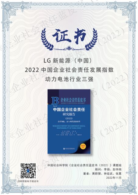 中國社科院教授、中國社會責任百人論壇秘書長鍾宏武對LG新能源(中國)的ESG工作給與了高度的評價:“2022年,LG新能源(中國)持續發揮行業履責標杆作用,進一步健全ESG治理體係,積極向社會公眾傳播ESG理念和履責動態,蟬聯動力電池行業社會責任發展指數第一,為助力中國動力電池行業可持續發展作出了卓越貢獻!”未來,LG新能源持續通過先進的研發能力、提供綠色產品,為全球用戶提供優質的科技服務和煥新體驗,並以改變人類生活的使命為動力源泉,致力成為ESG經營管理的領導者。
