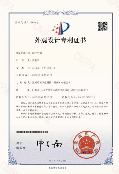 值得一提的是,泓博科技擁有經驗豐富的研發團隊、專業的工程方案設計團隊,其研發設計的製冷空調,榮獲國家外觀設計專利證書。