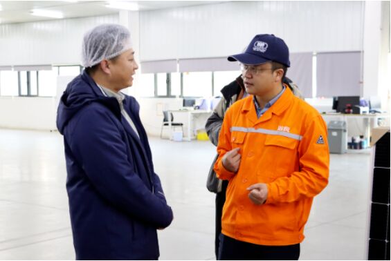 葉建群帶領王海生一行參觀了雙良新能科技高效光伏組件生產現場及雙良矽材料展廳,並對園區整體情況、生產流程及超級光能高效光伏組件產品優勢進行了詳細的介紹。