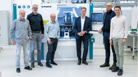 項目參與者在 BLS 500 前(從左到右):倍福銷售和係統谘詢工程師 Oliver Heilig,Manz 市場營銷和企業傳播負責人 Axel Bartmann,Manz 軟件核心設計和產品開發主管 Stephan Lausterer,倍福汽車行業經理 Jörg Rottkord 和 Tilman Plaß,以及 Manz 流程開發人員 Felix Röckel