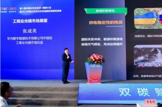 在第十屆中國分布式光伏+儲能論壇上,華為數字能源中國區智能光伏工商業光儲市場總監張成英分享了《工商業光儲市場展望-光儲融合全麵智能》,介紹了宏觀形勢、政策、市場熱點的變化,並對工商業光伏、儲能、光儲融合、BIPV等幾個場景的技術發展趨勢進行了洞察。