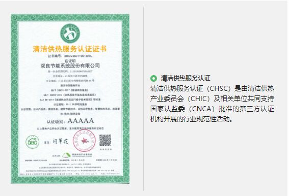 雙良節能憑借著雄厚的技術創新實力和優異的清潔智慧供熱項目運營能力,通過 “清潔供熱服務認證”5A級證書。