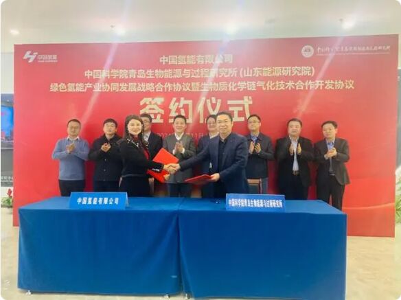 1月11日,中國氫能有限公司(以下簡稱“中國氫能”)與中國科學院青島生物能源與過程研究所(以下簡稱“青島能源所”)、山東能源研究院在青簽署綠色氫能產業協同發展戰略合作協議,“生物質化學鏈氣化技術項目”同步簽約落地。項目預計將於明年底在山東建成年產綠色甲醇10萬噸生產線,年產值約5億元,實現甲醇製備過程近零碳排放。
