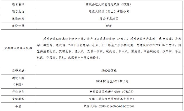 1月15日,四川省發展和改革委員會關於高效晶矽太陽能電池項目(四期)節能報告的審查意見(川發改環資函〔2024〕9號)公布。
