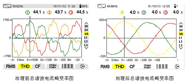 以下為貴陽電信治理效果:ZAPF有源濾波器投入後,電流總畸變率從44.1%降低到4.0%,大大提高了電網的電能質量,濾波效果非常明顯。