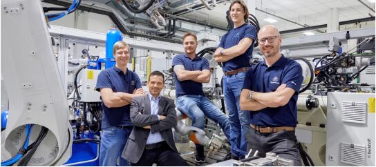 向器生產設計和自動化試驗台:聲學專家 Julius Ellmann、電氣工程師 Michael Sauerwein 和軟件專家 Karsten Mauersberger。在兩者之間(左二):瑞士倍福分公司銷售工程師 Maurus Kaelin