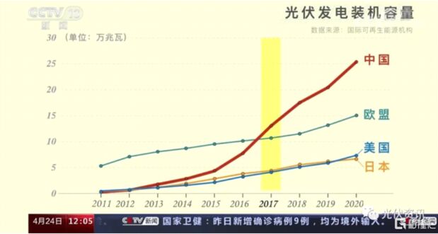 2011年,中國的裝機容量僅為日本、美國的六成,為歐盟的6%。從2013年起,國家加大節能減排力度,光伏產業快速發展。到2017年,中國的裝機容量就超過了整個歐盟的總和。