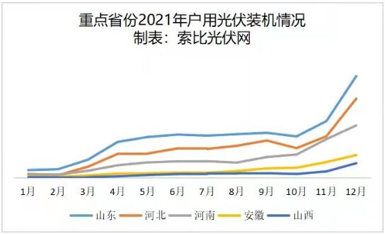 從2021年各省戶用光伏裝機規模看,山東、河北、河南依然是最核心的三個主力市場,安徽、山西、江西、福建、江蘇等5個省也實現了裝機超400MW、占比超2%的目標。