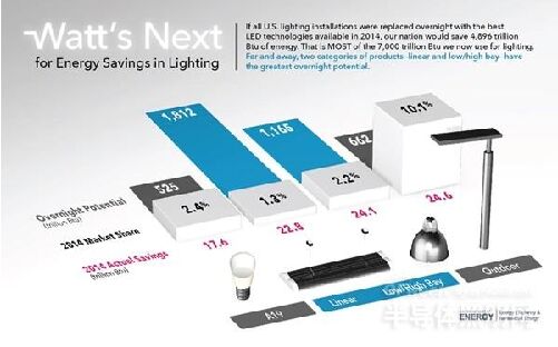 據悉,美國能源署(DOE)近日發布了一份題為《LED在普通照明應用中的使用》的報告。這項報告不僅估算了2014年LED在10大照明應用中的節能效果,還預估了這些照明應用完全采用LED產品的節能潛力。 據報告顯示,由於LED光源的采用,2014年節約能源為143萬億英熱單位(相當於節省成本約14億美元),但如果所有應用中的通宵照明產品都換成LED光源,將節約近4,896萬億英熱單位(相當於節省成本490億美元)。 2012-2014,LED在所有應用中的安裝量增加,整體增幅超過四倍至215萬,但市場滲透率仍然不大,攀升至3%。小型定向LED光源仍然是市場份額的領先者,從2012年的10%增加到2014年的22%,增長或在未來幾年放緩。2014年,LED光源占戶外應用市場份額為10%,占室內應用市場份額為2.8%。