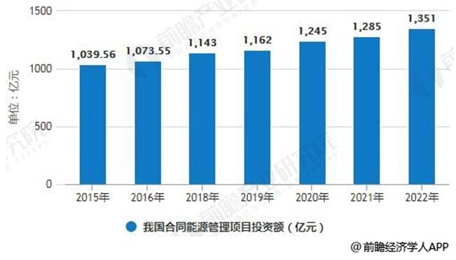 中國合同能源管理項目投資額分析預測 2015年,我國合同能源管理項目投資額為1039.56億元,同比增長8.43%。到了2016年我國合同能源管理項目投資額為1073.55億元,同比增長3.27%。綜合以上因素,預計2018年我國合同能源管理項目投資額將達到1143億元,未來五年(2018-2022)年均複合增長率約為4.26%,預測到了2022年我國合同能源管理項目投資額將達到1351億元。