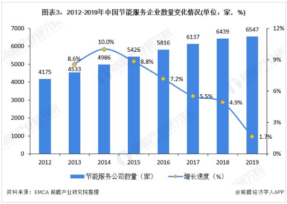 2、中國節能服務參與者數量逐年增加 據中國節能協會統計數據顯示,在過去十幾年間,全國運用合同能源管理機製實施節能項目的節能服務公司從最初的3家(北京EMCO、遼寧EMCO和山東EMCO),發展到2005年的76家,2010年進一步發展到782家。 2012-2019年,全國從事節能服務業務的企業數量逐年上升,但增速緩慢。根據中國節能協會發布的《2019節能服務產業發展報告》,截至2019年底,全國從事節能服務的企業有6547家,較上年增加108家,年增長率為1.7%,增長率較2018年降低3.2個百分點。