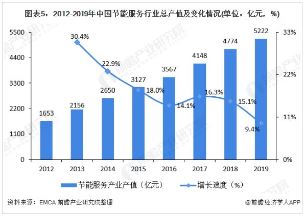 2019年EMCA的數據顯示,我國節能服務產業總產值從2012年的1653億元增長到2019年5222億yi元yuan,增zeng長chang速su度du持chi續xu下xia降jiang。近jin幾ji年nian來lai,我wo國guo節jie能neng服fu務wu產chan業ye利li好hao政zheng策ce頻pin發fa,加jia上shang國guo家jia對dui節jie能neng環huan保bao的de重zhong視shi程cheng度du不bu斷duan加jia深shen。從cong長chang遠yuan來lai看kan,未wei來lai隨sui著zhe節jie能neng服fu務wu產chan業ye規gui模mo的de不bu斷duan擴kuo大da,其qi發fa展zhan速su度du將jiang隨sui著zhe行xing業ye不bu斷duan的de接jie近jin飽bao和he發fa展zhan而er放fang緩huan,到dao2025年,全國節能服務產業總產值將約達到8080億元。