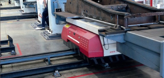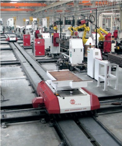 RGV 小車在三一臨港生產基地的結構件焊接車間中用於全自動生產挖掘機挖鬥和動臂