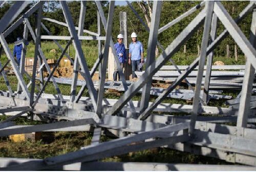 2月14日,在巴西納雄耐爾港,山東電建一公司員工楊官輝(左)和武曉成在施工現場工作。彼時,巴西美麗山水電站特高壓輸電工程二期項目第五標段建設正在納雄耐爾港有序進行。