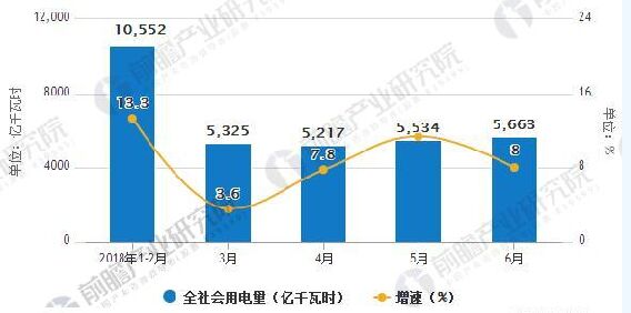 據前瞻產業研究院發布的《電力行業市場前瞻與投資戰略規劃分析報告》最新統計數據顯示,6月份,全國全社會用電量5663億千瓦時,同比增長8.0%。2018每年1-6月份,全國全社會用電量32291億千瓦時,同比增長9.4%,增速比上年同期提高3.1個百分點。