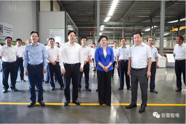7月10日, 江蘇省委常委、南京市委書記、省智能電網產業鏈鏈長韓立明率領江蘇省智能電網產業鏈專班來到安靠智電中關村廠區調研,常州市領導陳金虎、方國強,溧陽市領導徐華勤、葉明華、邵欽華、莊鬆年、趙明陪同調研。安靠智電董事長陳曉暉、總經理陳曉淩熱情接待了專班。