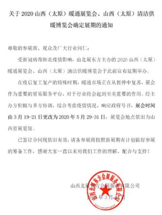 根gen據ju新xin型xing肺fei炎yan疫yi情qing防fang控kong需xu要yao,為wei貫guan徹che落luo實shi黨dang中zhong央yang和he山shan西xi省sheng政zheng府fu做zuo好hao新xin型xing冠guan狀zhuang病bing毒du感gan染ran的de肺fei炎yan疫yi情qing防fang控kong工gong作zuo,切qie實shi保bao障zhang廣guang大da參can展zhan商shang和he觀guan眾zhong及ji各ge界jie朋peng友you們men的de健jian康kang安an全quan,確que保bao參can展zhan企qi業ye的de參can展zhan效xiao果guo和he采cai購gou商shang的de參can觀guan體ti驗yan,原yuan定ding於yu3月19-21日在山西舉辦的2020山西(太原)暖通展覽會延期至5月29-31日舉辦。