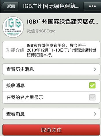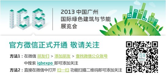 廣州綠色建築展,2013年12月11日-13日在廣州琶洲保利世貿博覽館隆重開幕。目前已啟動官方預登記(http://www.igbchina.com/can-guan-yu-deng-ji-2/),登記即有六重好禮大贈送,隻限前1000名。輕輕動下手指趕快關注廣州綠建展吧。 您可以通過以下方式關注廣州綠色建築展: 方法一: 打開添加朋友頁麵—查找微信公眾賬號