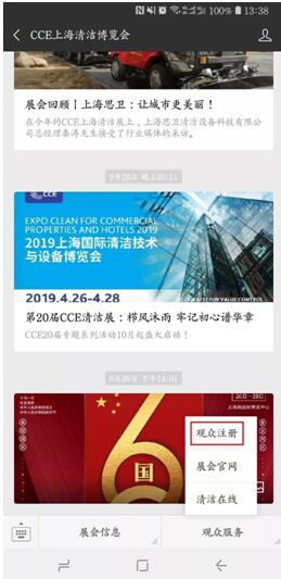 亞洲清潔行業旗艦展――2019上海國際清潔技術與設備博覽會觀眾注冊係統於2018年10月17日正式上線,提前預登記即可免費免排隊入場! 2019上海國際清潔技術與設備博覽會觀眾預登記開啟後,電腦端用戶可以登錄展會官方網站:www.chinacleanexpo.com,移動端用戶可以通過展會官方微信:CCE上海清潔博覽會,點擊首頁“觀眾登記”完成觀眾注冊,不僅可免費免排隊入場,同時,到場更有好禮相送!