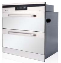 不鏽鋼材質,圓弧拉手設計 智能感應觸摸屏設計 電磁安全門鎖會自動上鎖,防止臭氧外泄,意外輻射和燙傷 LED數碼顯示,觸摸式按鈕,全程微電腦控製 臭氧紫外線組合雙重消毒 獨特的外導軌設計,防止內腔二次汙染